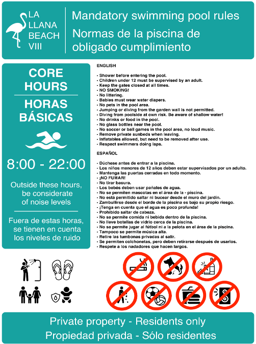 Alle har ansvar for å holde La Llana Beach VIII rent. Unngå unødvendige kostnader ved å ta vare på felles eiendom og ikke skade infrastruktur, personer eller eiendom.